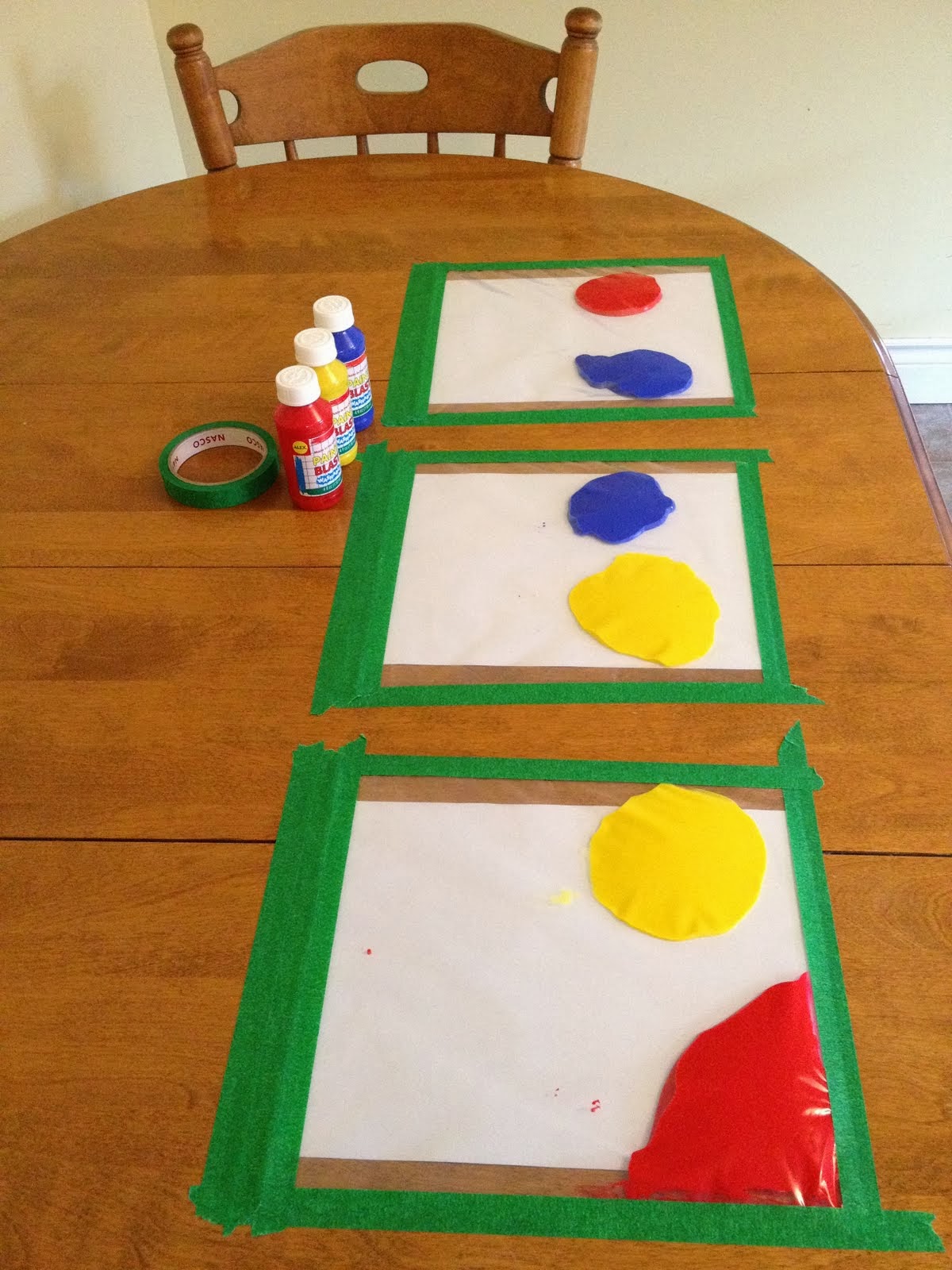 - Después dentro de la bolsa ponemos un poco de pintura de un color a un lado y de otro al otro.